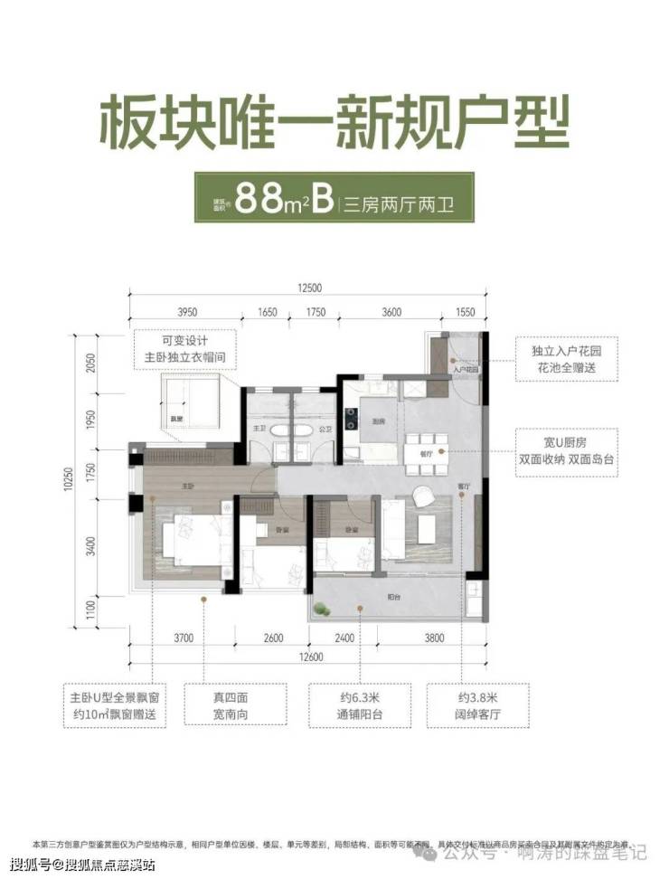 户型亮点:约 3.4 米开间客厅,约3.4米L型飘窗主卧