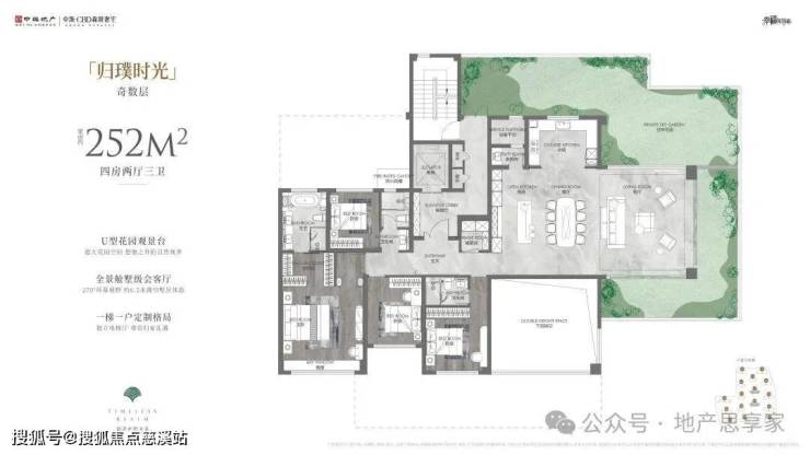 项目的“王牌”产品为252㎡户型,最大亮点为奇数层采用联通南北露台的 U型花园设计 。同时搭配 6.2米室内挑高+270°环幕 ,空间质感极大提升。