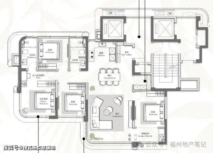 38㎡主卧套、48㎡端厅,空间感还不错。主卧转角设计增加视野;但电梯厅的采光和独立性一般,设计倒挂。