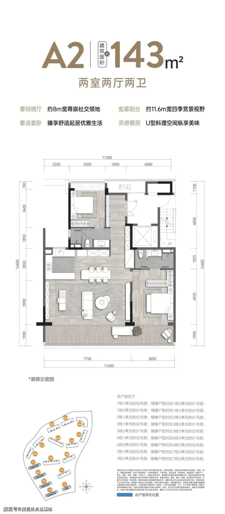 :约 8m 奢阔横厅,打造尊崇社交领地;奢适套卧设计,保障起居优雅;约 11.6m 宽幕阳台,四季赏景无遮挡;U 型灵感餐厨,纵享烹饪乐趣。