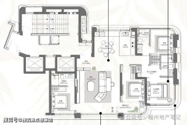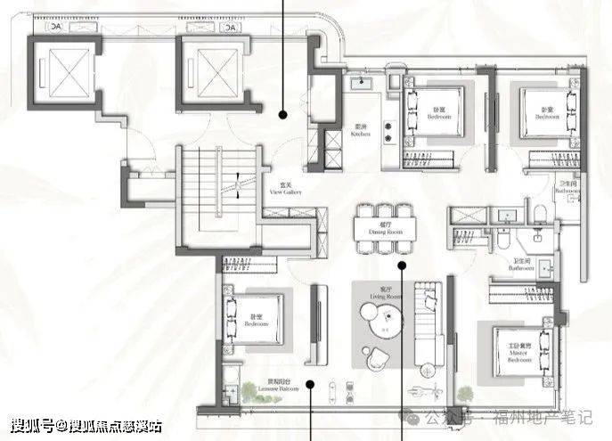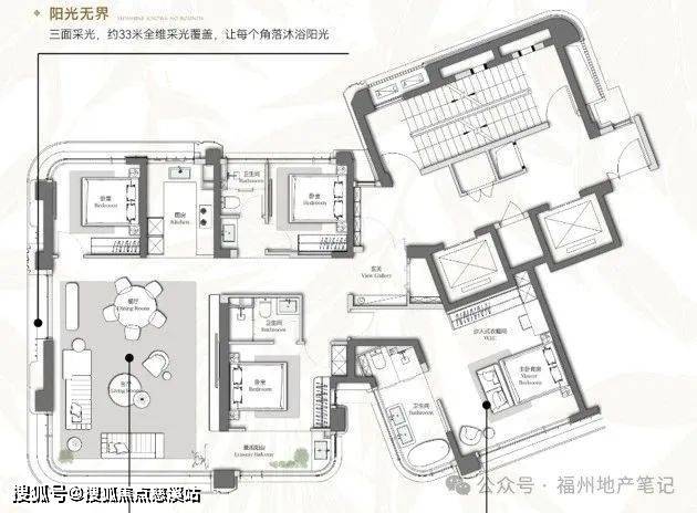 38㎡主卧套、48㎡端厅,空间感还不错。主卧转角设计增加视野;但电梯厅的采光和独立性一般,设计倒挂。