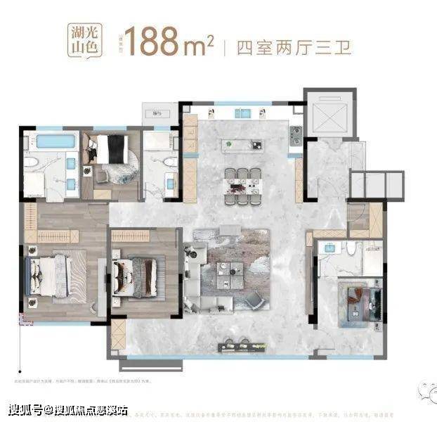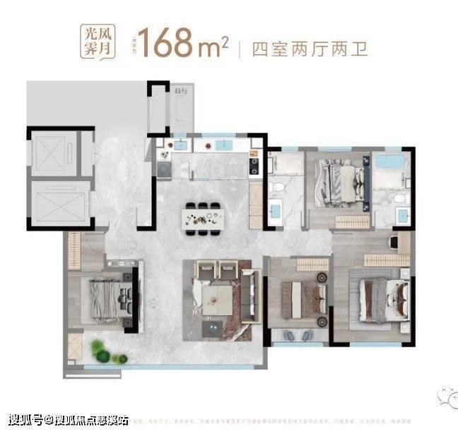 168㎡以上户型延续了臻誉的优良基因,基本都是南向四面宽、双阳台。168㎡三卧室朝南、LDKB聚合家庭厅、5.7m宽厅和8.8m南向双阳台。