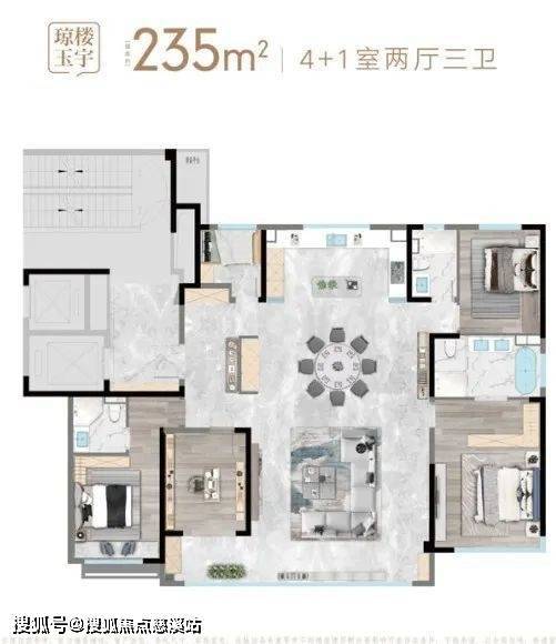 235㎡做了两个户型,四室户型做了16.5m四面宽和 270°瞰景边厅设计,4+1室户型做了洄游动线和灵动空间设计。