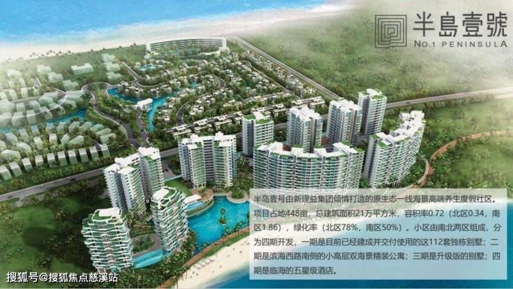 半岛一号由海南盈海置业有限公司开发建设,打造的是一个原生态一线海景高端养生度假社区。整个项目占地448亩,总建筑面积21万平方米,容积率0.72(北区0.34,南区1.86),绿化率(北区78%,南区50%)。小区由南北两区组成,分为四期开发一期是目前已经建成并交付使用的这112套独栋别墅;二期是滨海西路南侧的小高层双海景精装公寓;三期是升级版的别墅;四期是临海的五星级酒店。