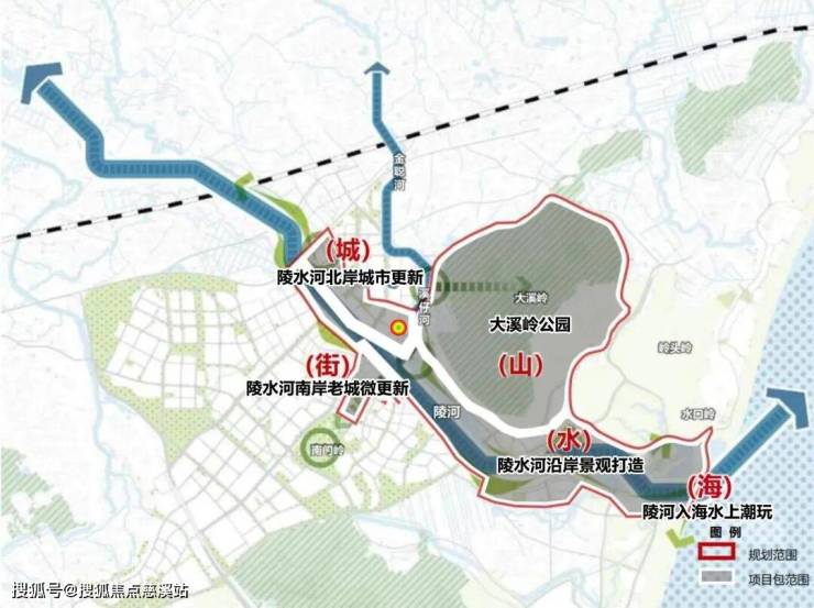 项目规划总面积约11.4平方公里,包括大溪岭公园(山)、陵河沿岸景观打造(水)、陵水河南岸老城微更新(街)、陵水河北岸城市更新(城)、陵河入海水上潮玩(海)五个子项目,整体项目依托陵水河开发,傍山邻水望海瞰街,形成以美好栖居、商业服务、产业办公为主,集“山、水、街、城、海”功能规划于一体的滨水理想新城中心。