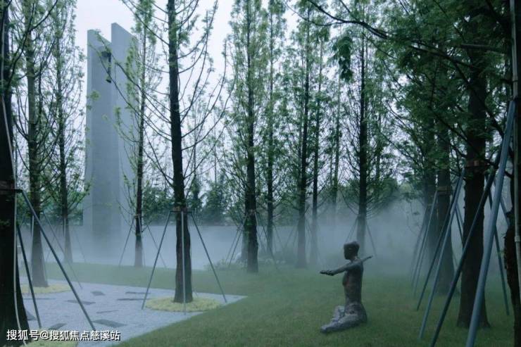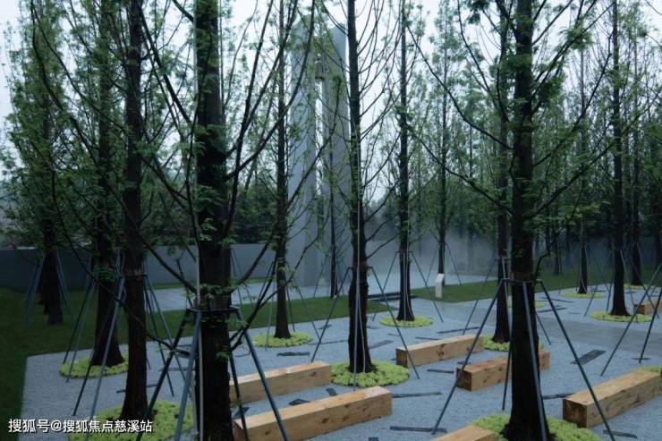 设计利用周界的自然高差,隔绝了城市的喧嚣,人们在水杉林下的自然栖息,让作为场地精神图腾的钟塔传达与生活的共鸣。