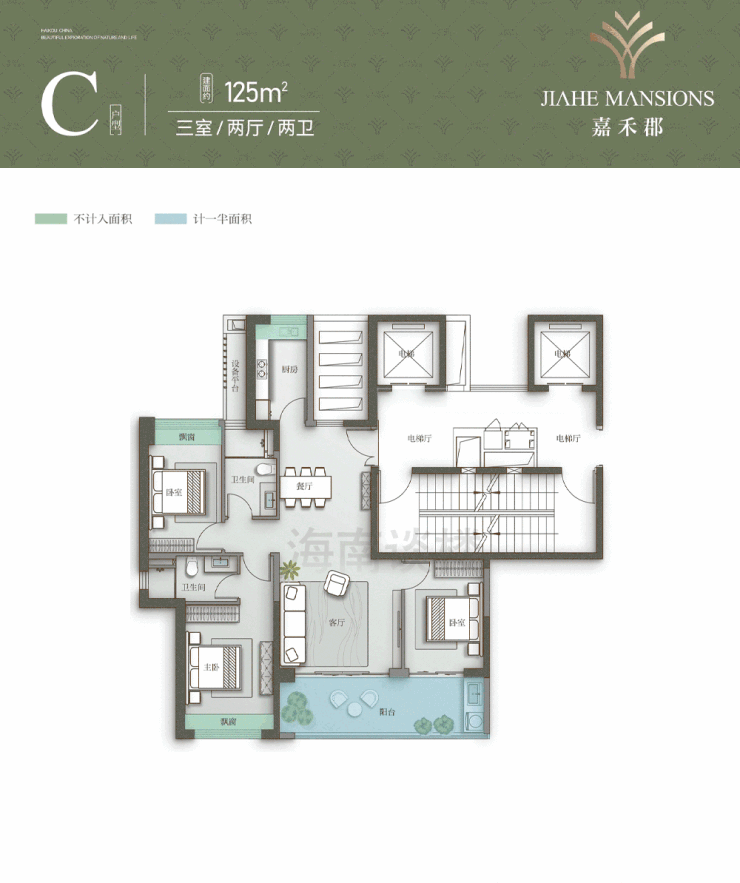 |C户型125㎡,三室两厅两卫