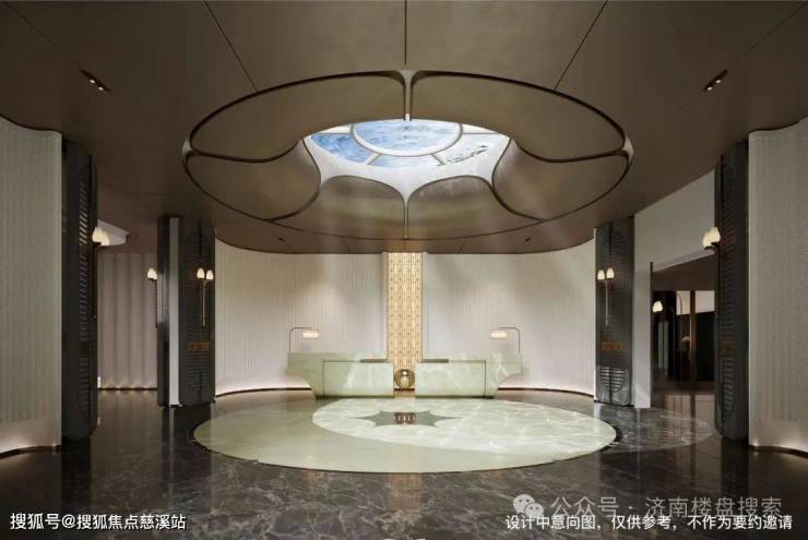 ▶ 奢配恢宏穹顶光瀑的百合光厅:模拟百合花卉之形,青玉与深古铜不锈钢天花,辉映璀璨天光,自成通透无垠之境