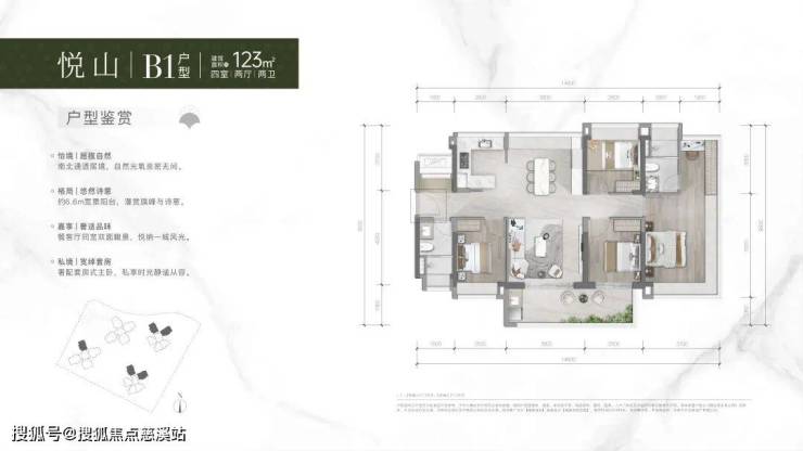 1号楼B1户型设计独特,两条腿朝向不同,西北向和西南向均有分布。虽为竖厅设计,但实现了四开间布局,一侧多个飘窗,采光极佳。户型灵活,可作三居室或四居室。打掉次卧,客厅可变宽敞大横厅,开间超6米,豪宅风范尽显。唯一遗憾是仅有一个阳台,一条腿朝北,在东莞多雨天气可能晒不到太阳。