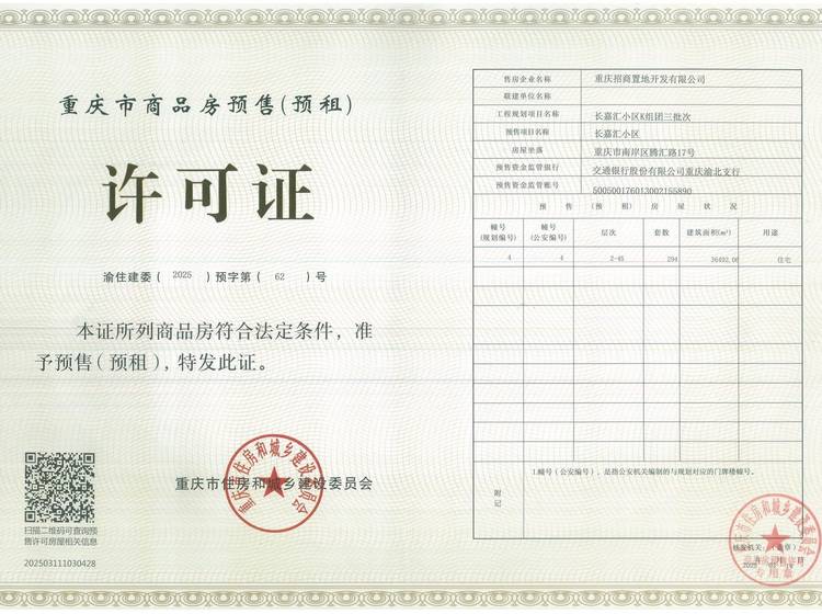 - 渝住建委(2024)预字第(165)号 详情发证时间 2024-05-13绑定楼栋南区5号楼