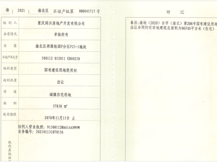 - 渝(2023)渝北区不动产权第001054895号 详情发证时间 2023-10-16绑定楼栋5幢(规划B5号楼)