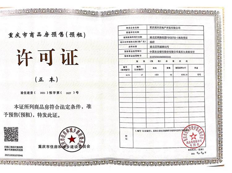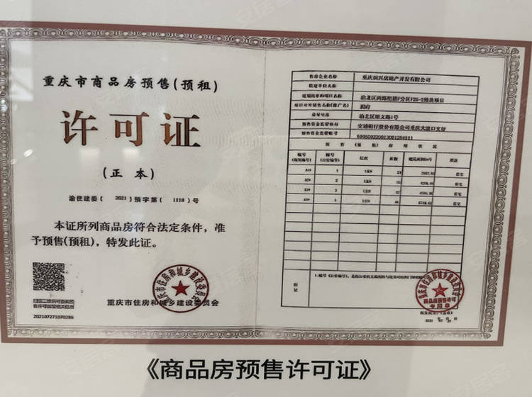 - 渝住建委(2021)预字第(1118)号 详情发证时间 2021-07-29绑定楼栋A1#,A2#,A3#,A4#