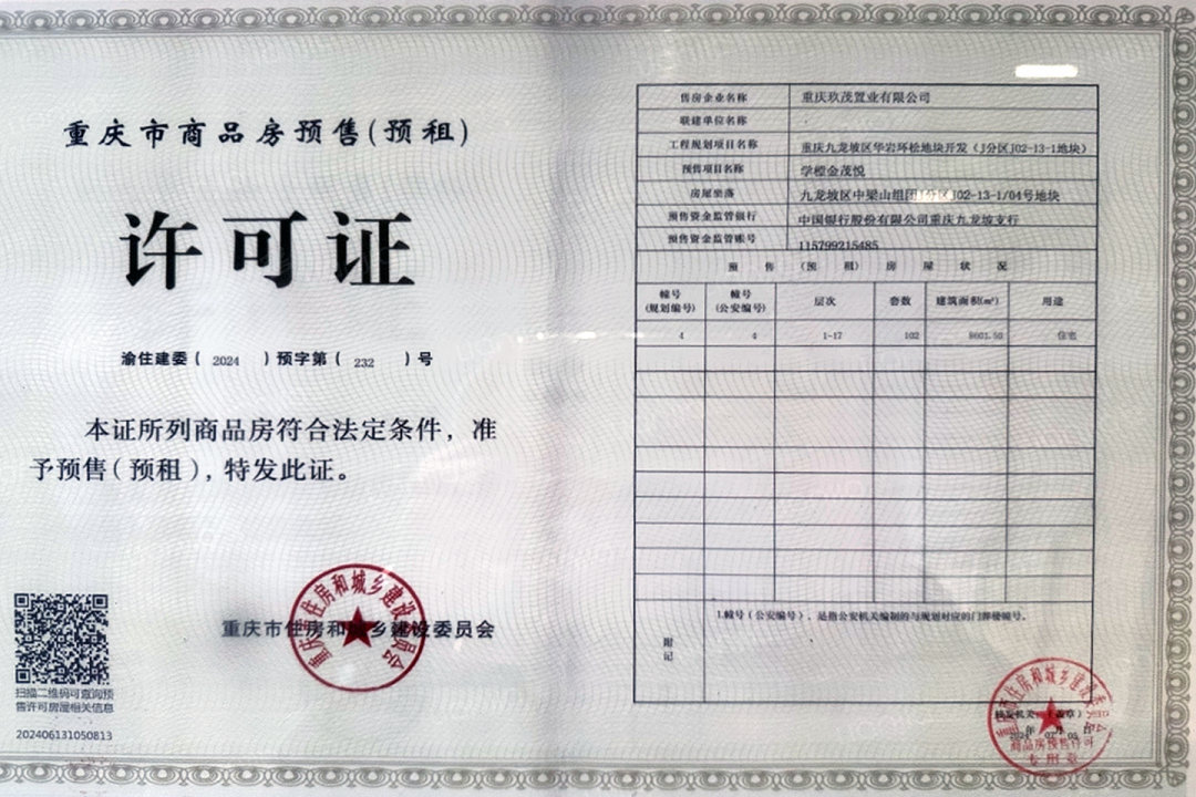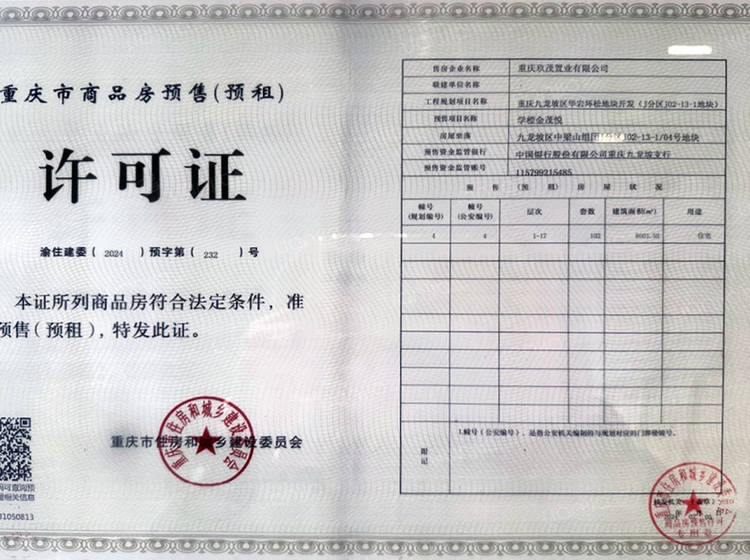 - 渝住建委(2024)预字第(232)号 详情发证时间 2024-07-05绑定楼栋二期4#证件照片