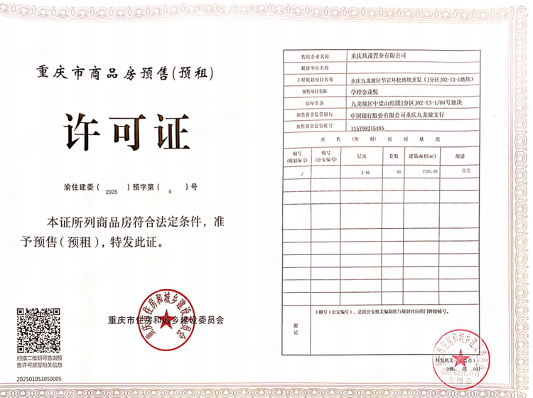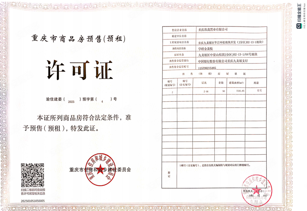 - 渝住建委(2025)预字第(52)号 详情发证时间 2025-03-05绑定楼栋1幢( 规划1号楼)