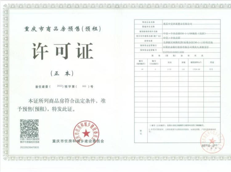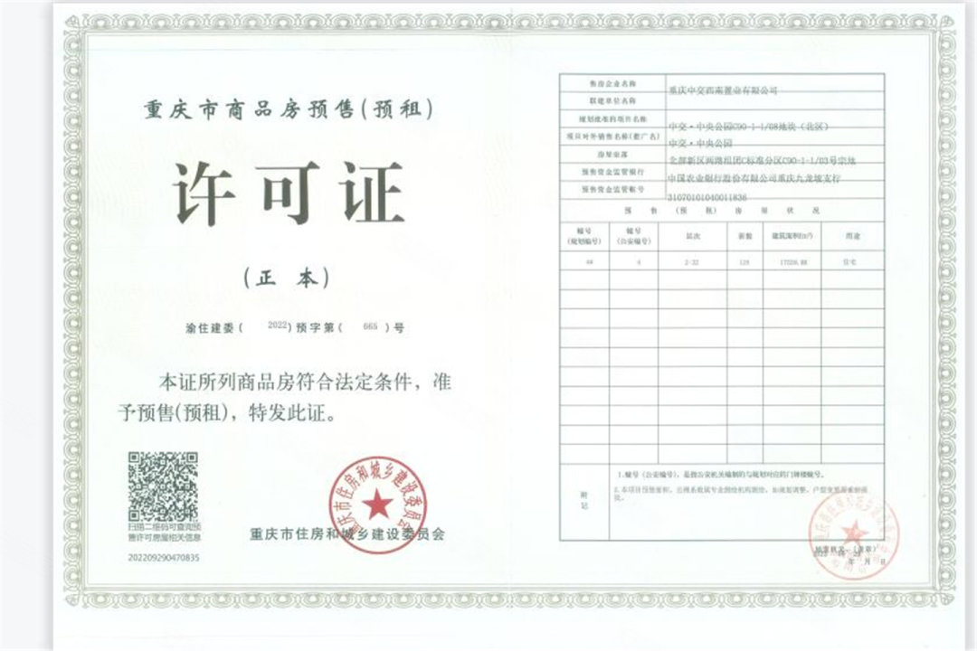 - 渝住建委(2022)预字第(665)号 详情发证时间 2022-09-29绑定楼栋大平层4#证件照片