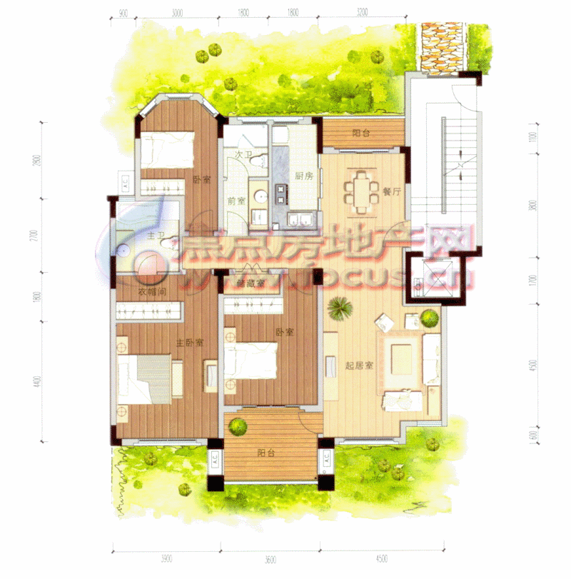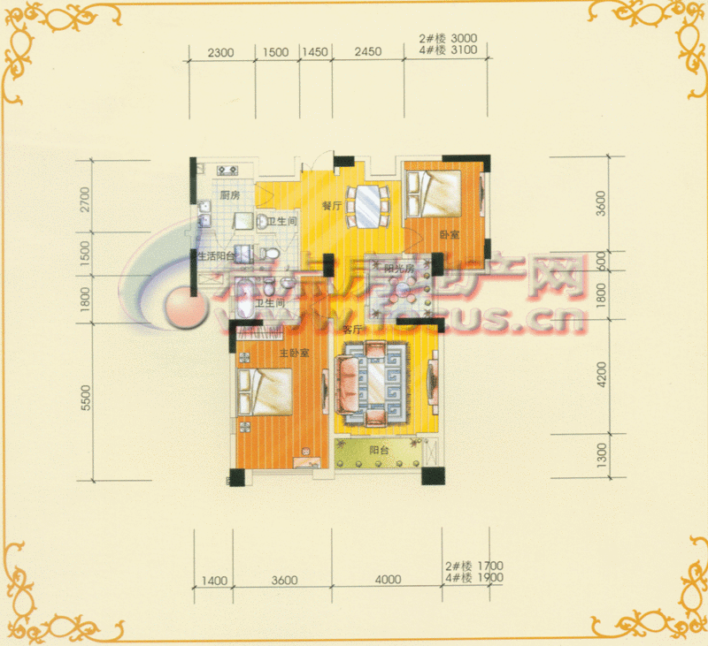 2室3厅2卫-雅园花园洋房D户型平面图三房两厅两卫132.17㎡
