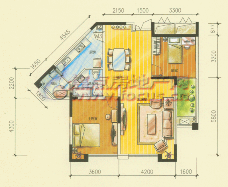 2室2厅1卫-天江鼎城5、6号楼1-2蓝调空间两室两厅一卫面积84.98㎡