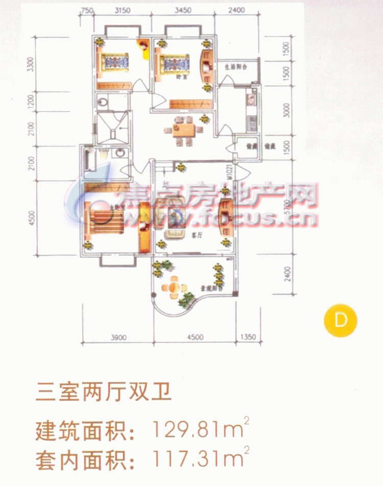 3室2厅2卫-D型错层三室两厅双卫117.31㎡