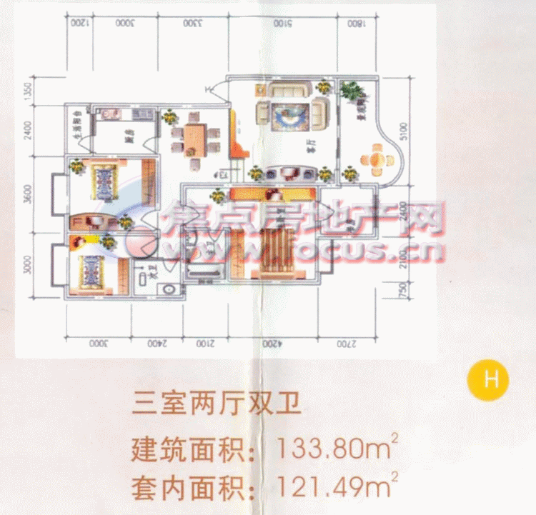 3室2厅2卫-H型错层三室两厅双卫121.49㎡