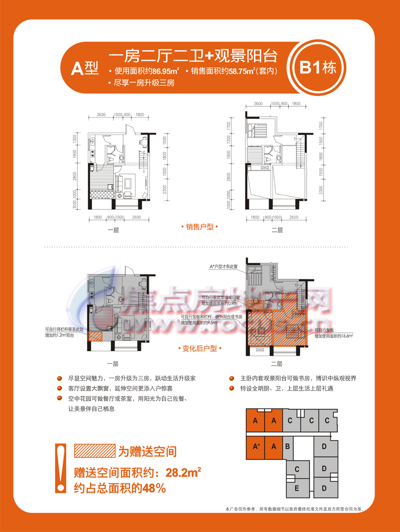 1室2厅2卫-金科蚂蚁SOHO二代B1栋A型一室两厅两卫套内58.75㎡