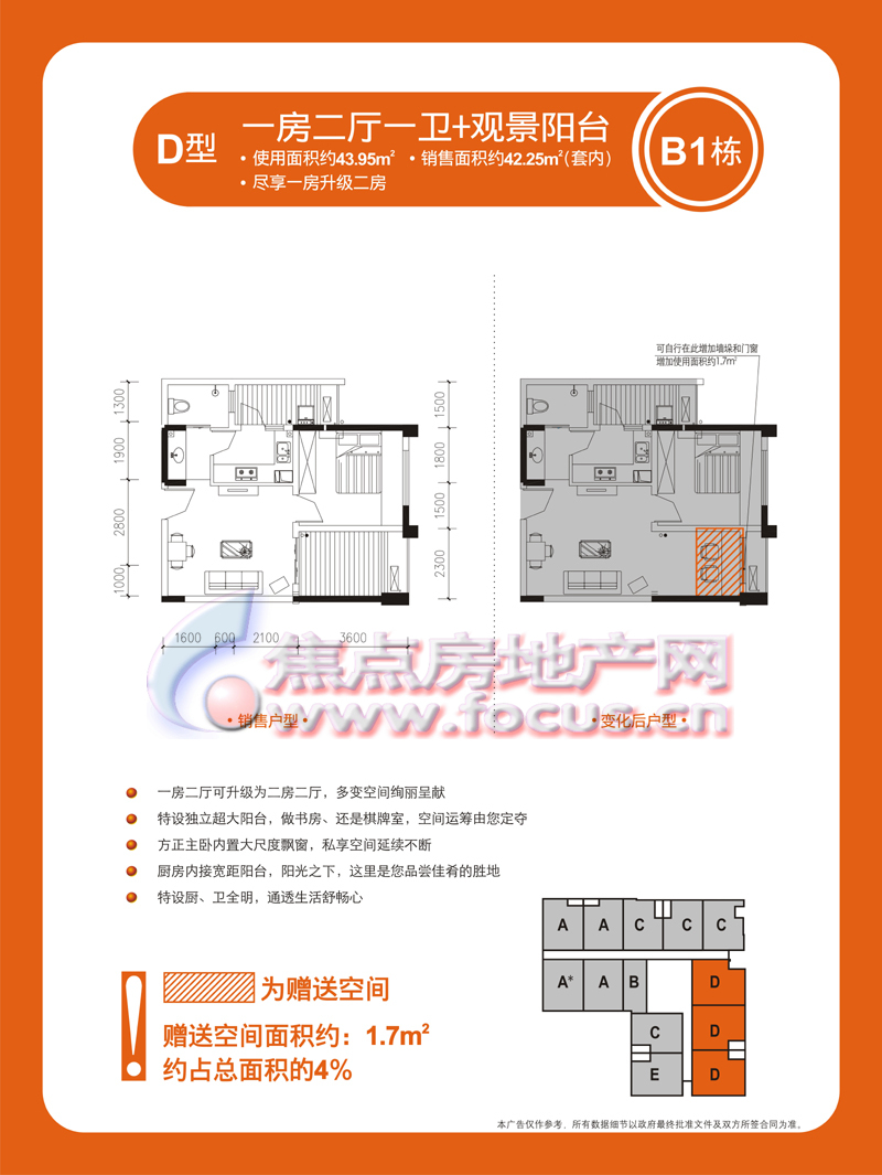 1室2厅1卫-金科蚂蚁SOHO二代B1栋D型一室两厅一卫套内42.25㎡