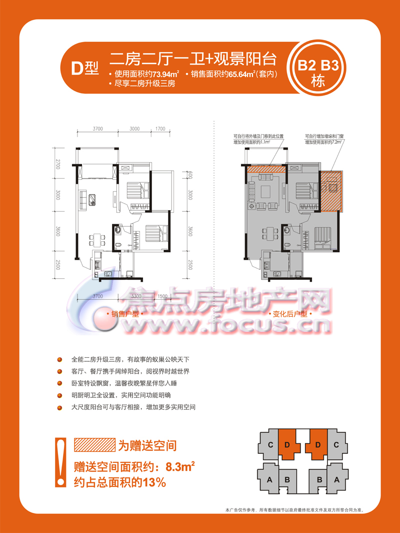 2室2厅1卫-金科蚂蚁SOHO二代B2、B3栋D型两室两厅一卫套内65.64㎡