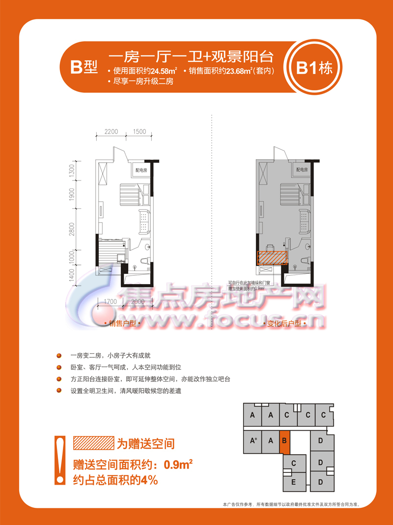 1室1厅1卫-金科蚂蚁SOHO二代B1栋B型一室一厅一卫套内23.68㎡