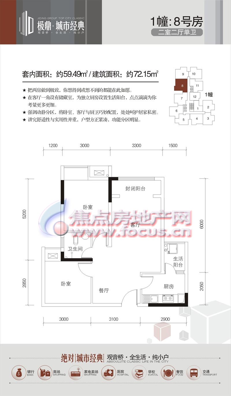 2室2厅1卫-极鼎城市经典1幢8号房两室两厅一卫套内59.49㎡