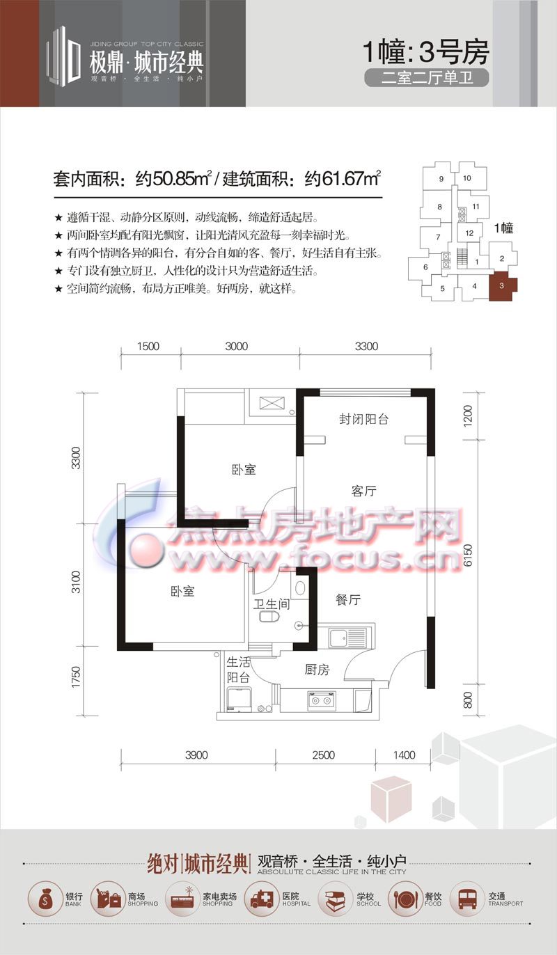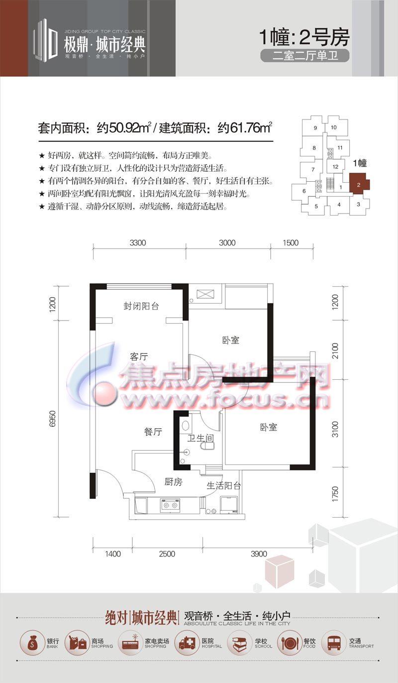 2室2厅1卫-极鼎城市经典1幢3号房两室两厅一卫套内50.85㎡
