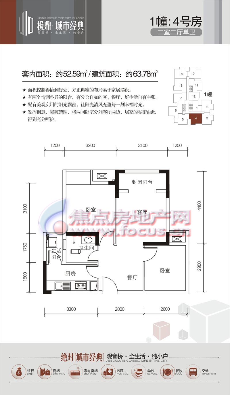 2室2厅1卫-极鼎城市经典1幢4号房两室两厅一卫套内52.59㎡