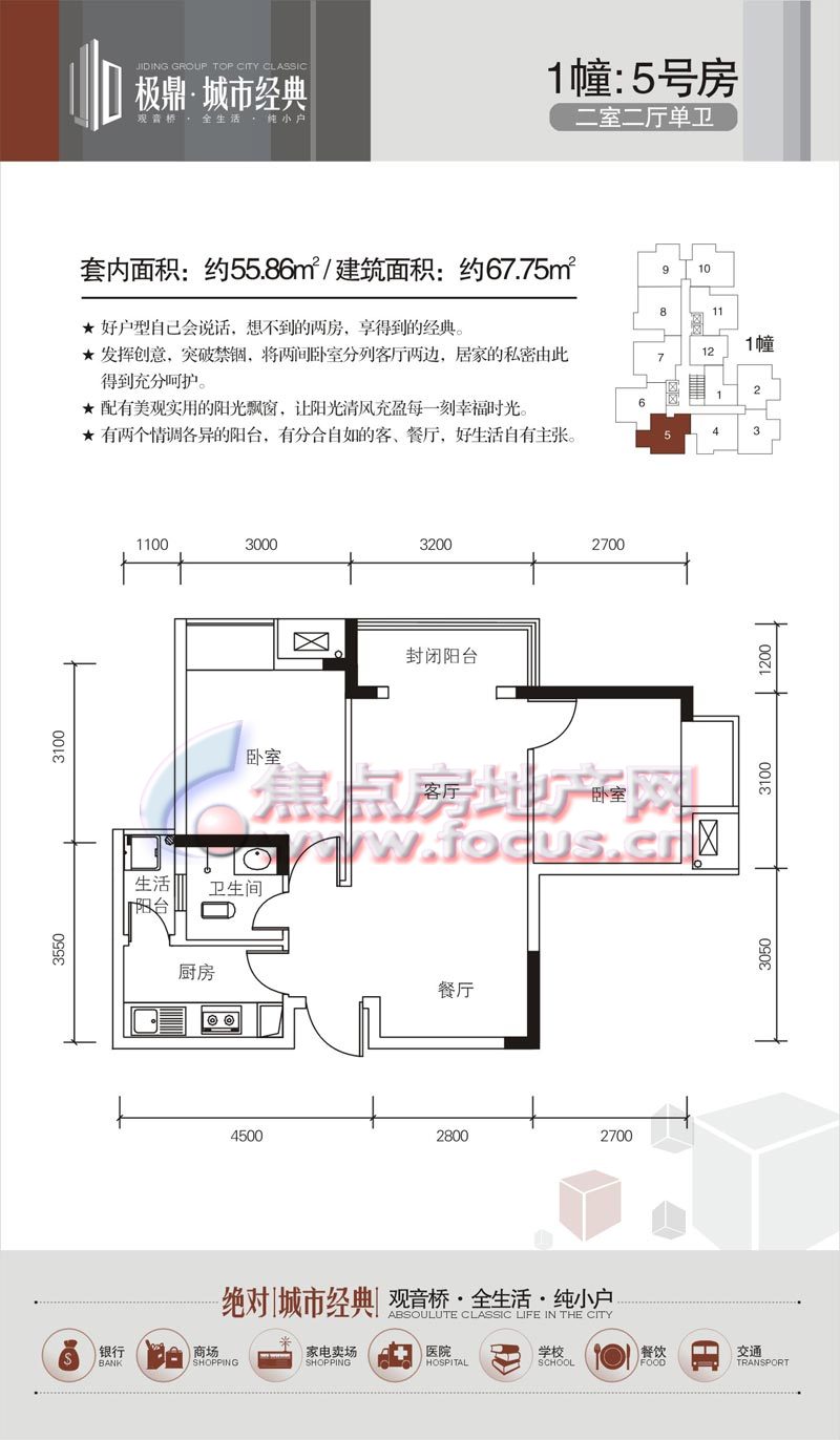 2室2厅1卫-极鼎城市经典1幢5号房两室两厅一卫套内55.86㎡