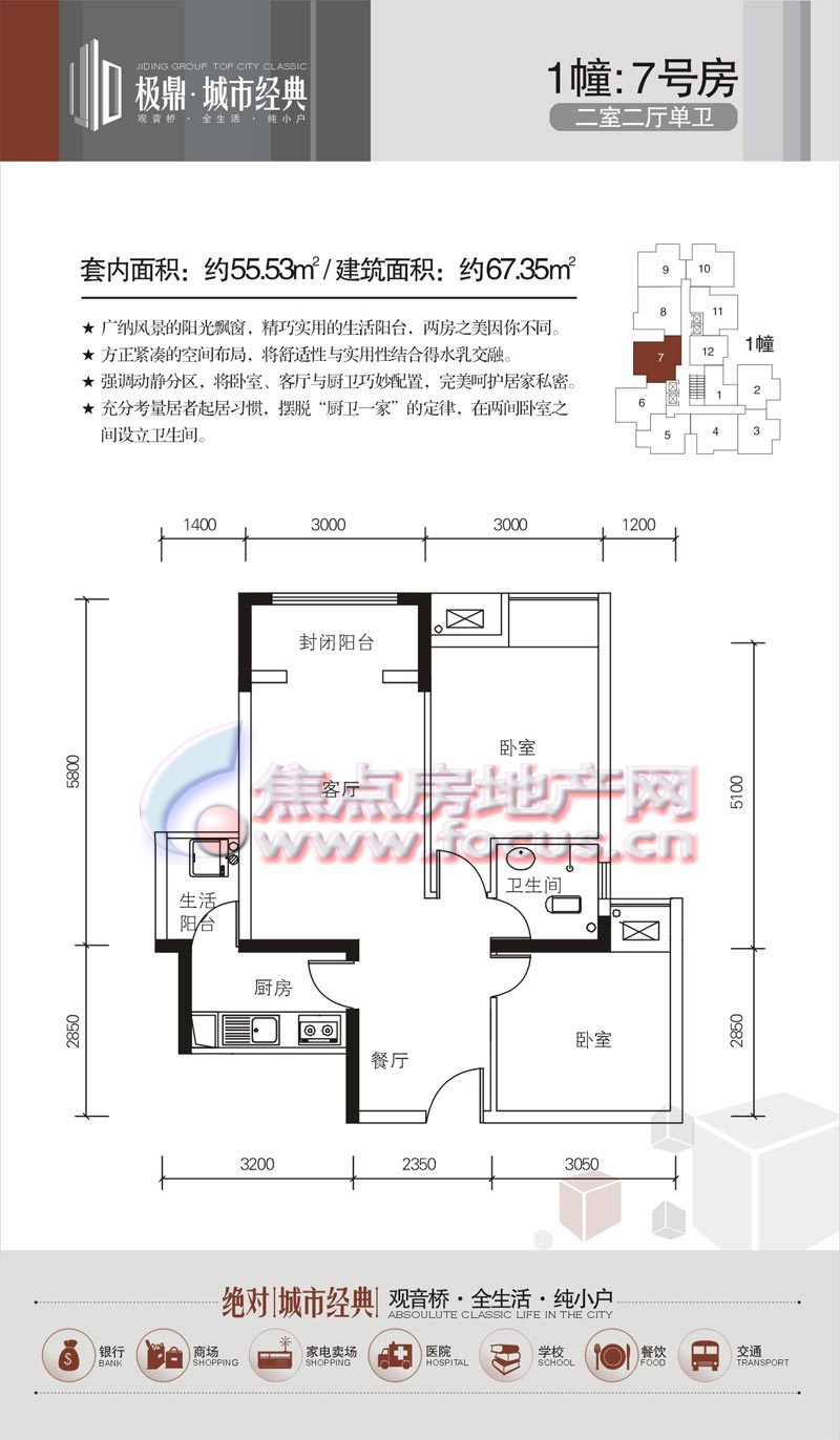 2室2厅1卫-极鼎城市经典1幢7号房两室两厅一卫套内55.53㎡
