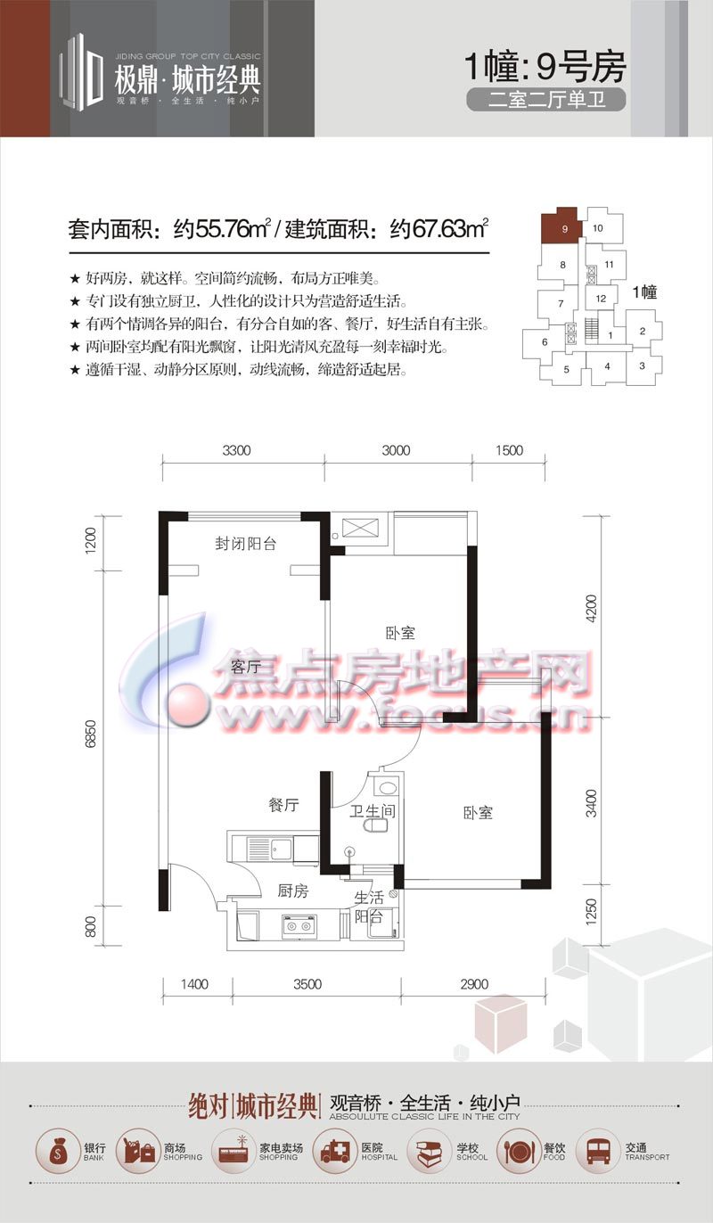 2室2厅1卫-极鼎城市经典1幢9号房两室两厅一卫套内55.76㎡