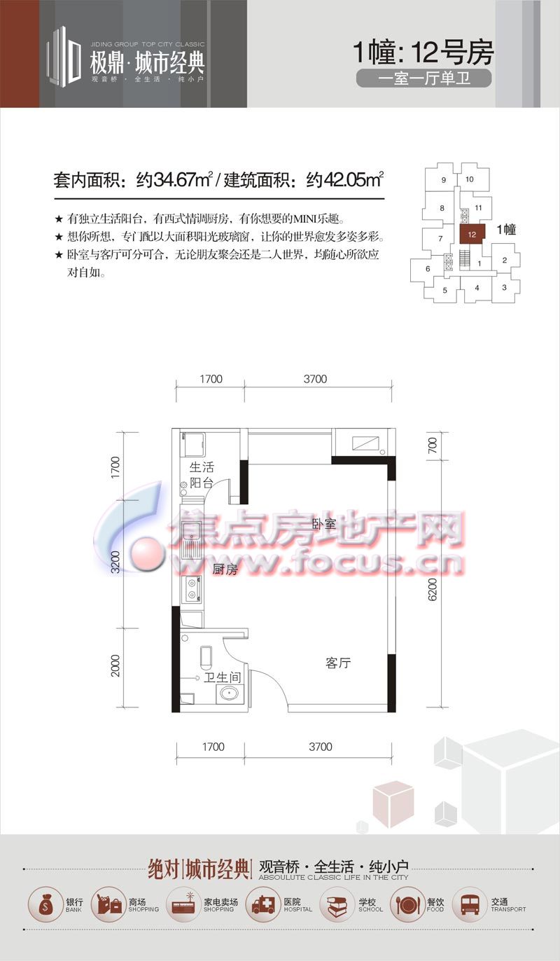1室1厅1卫-极鼎城市经典1幢12号房一室一厅一卫套内34.67㎡