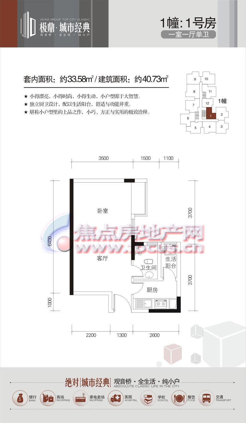 1室1厅1卫-极鼎城市经典1幢1号房一室一厅一卫套内33.58㎡