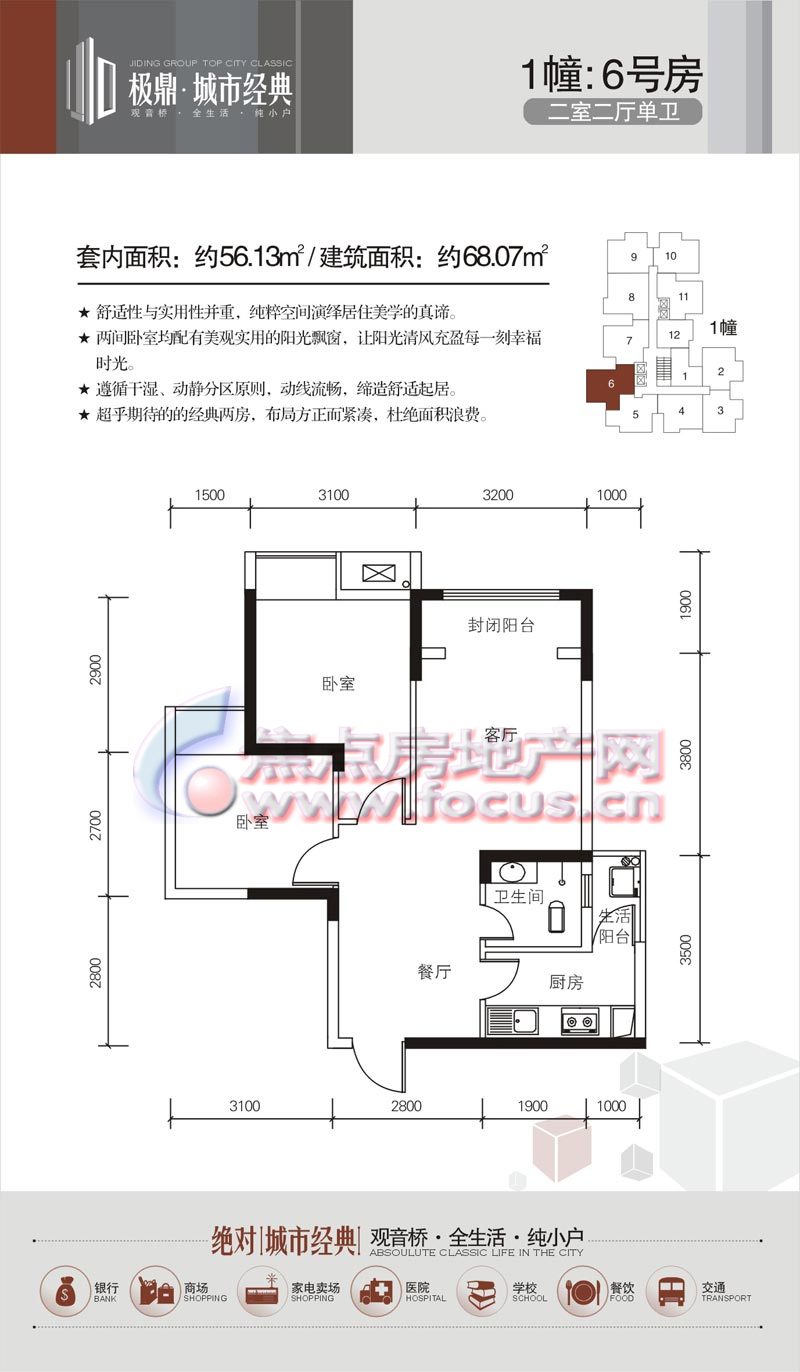 2室2厅1卫-极鼎城市经典1幢6号房两室两厅一卫套内56.13㎡