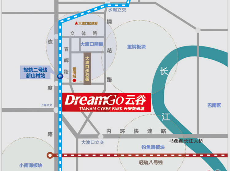 天安数码城云谷毗邻轻轨二号线新山村站,同时靠近内环大渡口入口,“五纵五横”交通网络实现园区距辐射主城核心商务圈,为企业提供商务拓展环境和出行方式。