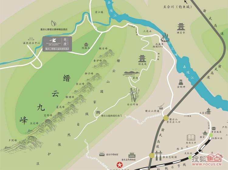 心景缙云国际温泉度假中心位于缙云山风景区内,毗邻嘉陵江与壁北河,规划占地约1000亩,总建筑面积约30万平方米,总投资30亿元,项目分两期开发,一期由心景缙云温泉度假酒店(五星)、温泉度假精装公寓、艺术运动公园构成,二期由心景缙云佛禅主题度假酒店(五星)、高端别墅群构成。