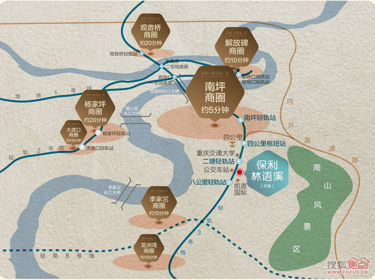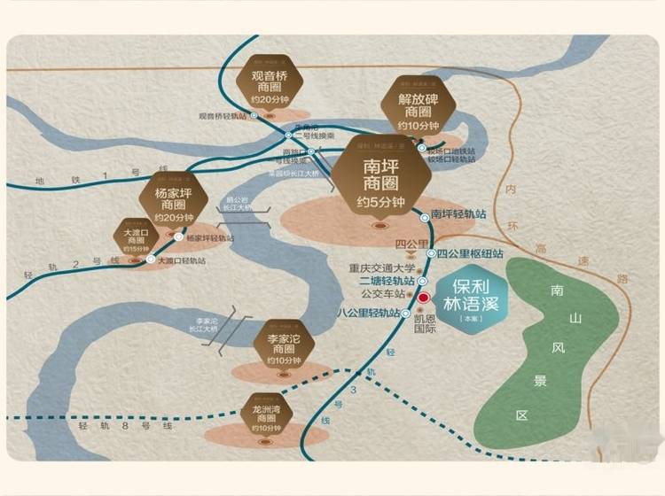 保利林语溪项目位于重庆渝南大道9号,保利林语溪门口设有公交站台,20余条公交线路快速通达全城。所在区域高校、科研院所林立,是重庆南岸人文书香氛围的现代城区。