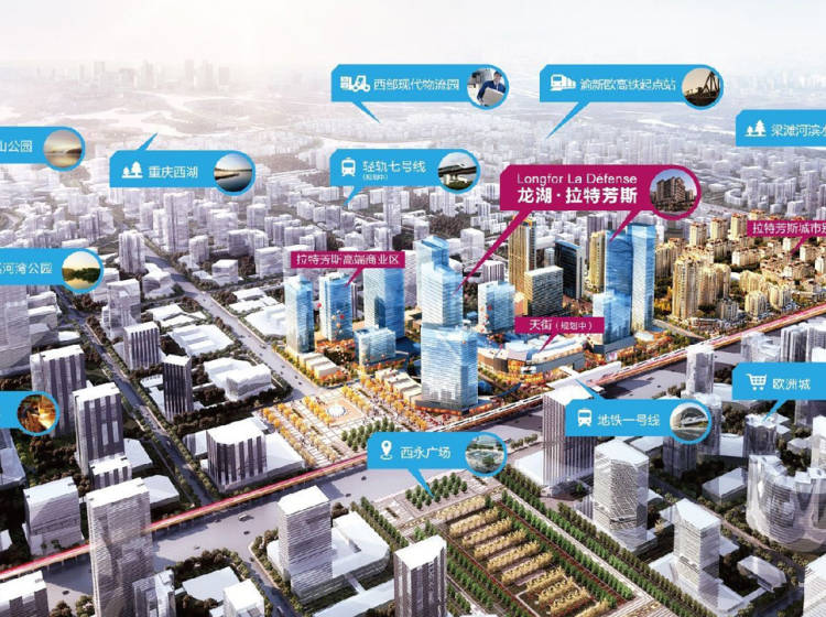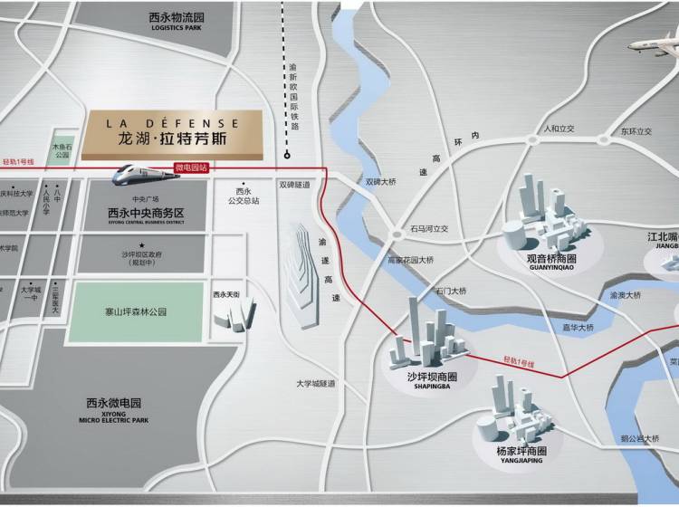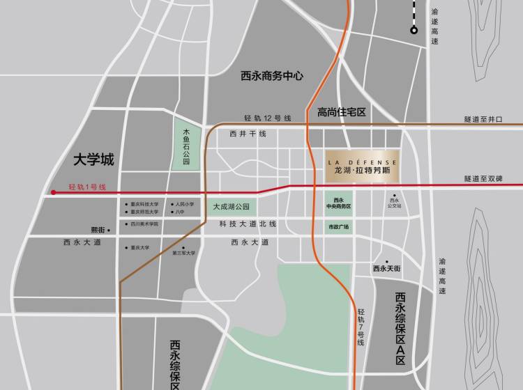 龙湖拉特芳斯地处重庆大学城西永商务区——龙湖新城市!西永商务中心与江北机场的直线距离约为30公里,距沙坪坝副中心约12公里,距观音桥副中心17公里,距离解放碑CBD约22公里。与传统老城区相比,西永商务中心不仅拥有中梁山和缙云山的丰富自然资源,同时通过多条联络线、穿山隧道、轨道交通的建设,使其大大缩短了与重庆老城区的距离。再加上“三横一纵三线”的区域交通网络,与周边的大学城、西永综保区、西部现代物流园区、重庆高新区拓展区形成了良好的区域交通联系 三横:西井干道、科技大道北线、西永大道。 西井干道:北侧东西走向,向东通过井口隧道至沙坪坝井口,向西进入大学城北部,至缙云山脚的绕城高速路。 科技大道北线:中部东西向贯穿西永商务中心,向东对接通往三北地区的双碑隧道,向西直抵缙云山脚的绕城高速路。 西永大道:南部东西走向,向东对接渝遂高速和大学城隧道,向西对接绕城高速路,可便捷通达沙坪坝。 一纵:贯穿西永商务中心的南北向快速路一纵线,向北至二环高速,向南至黄磏港。 三线:指设计范围内规划的三条轨道交通线,两两相交,在西永商务中心形成两个轨道枢纽站,分别位于西井干道和科技大道北线。 轨道1号线(已开通):东西向,由朝天门经两路口、沙坪坝、西永至璧山