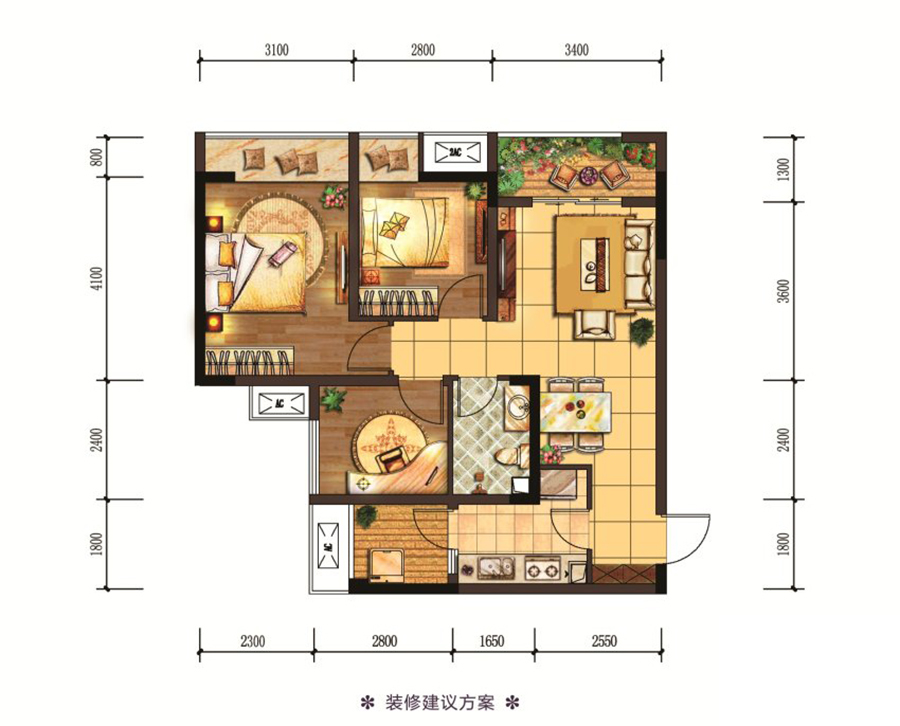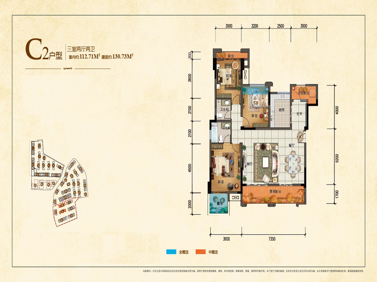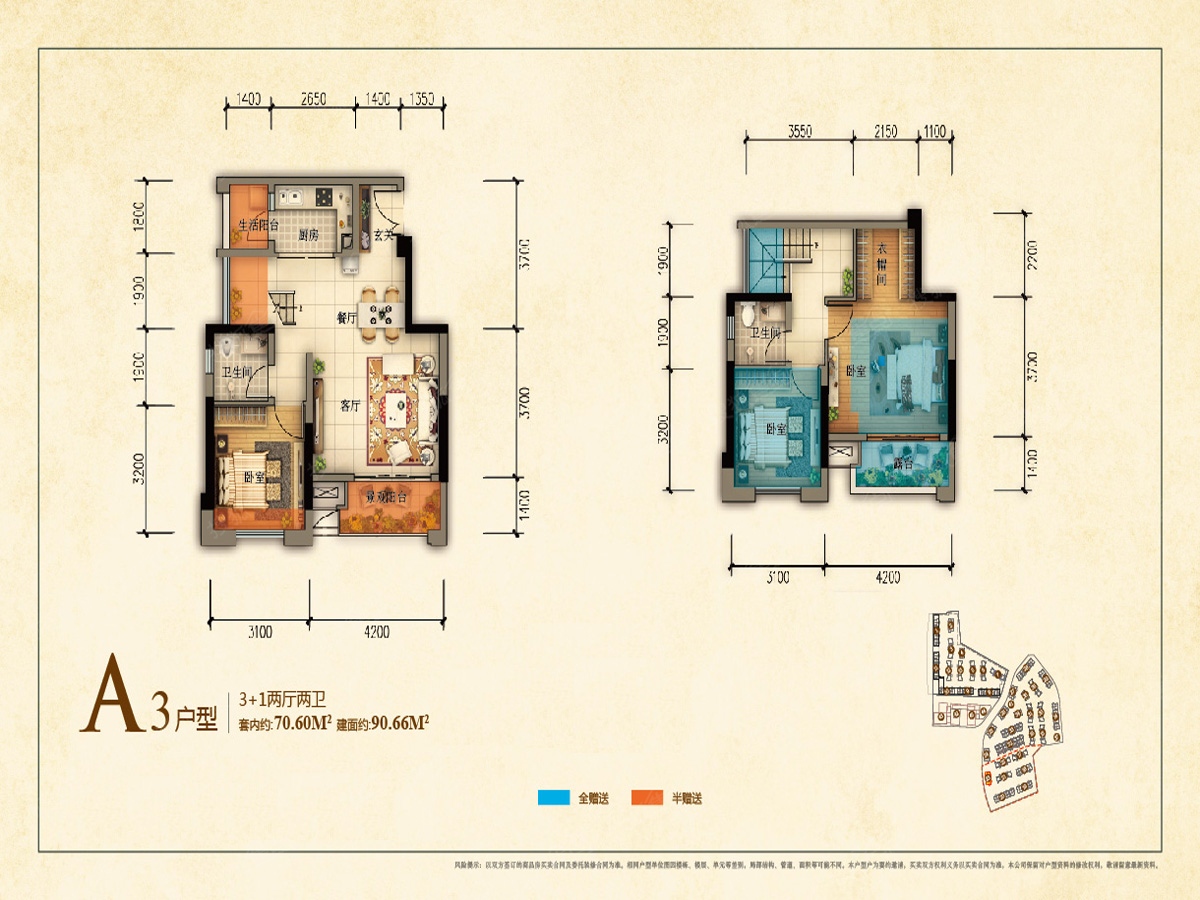 2室2厅1卫-高层A3户型,2室2厅1卫1厨