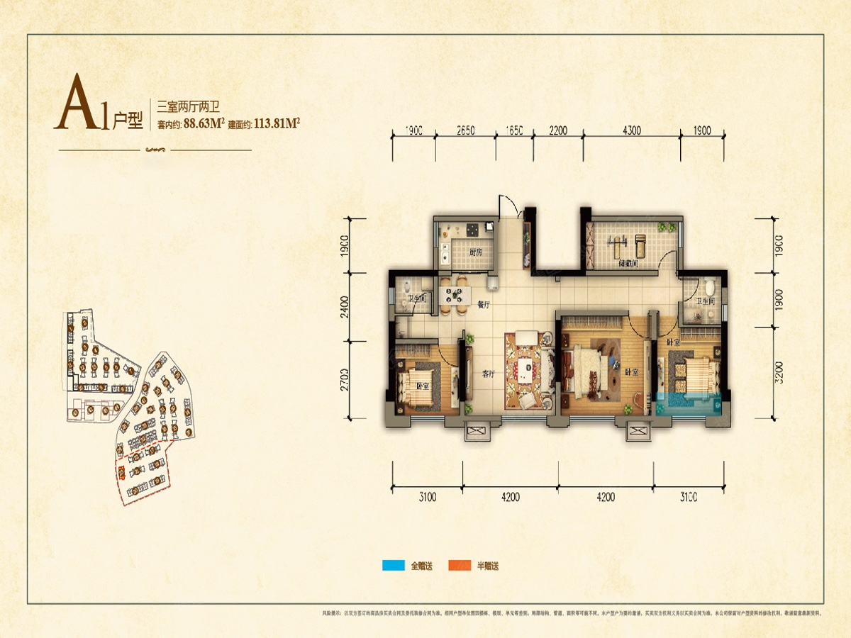 2室2厅1卫-高层A1户型, 2室2厅1卫1厨