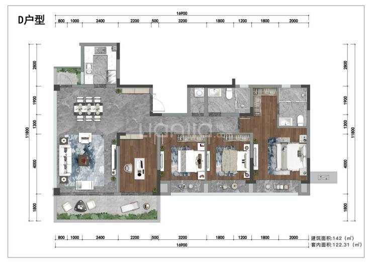 建面约142平套四