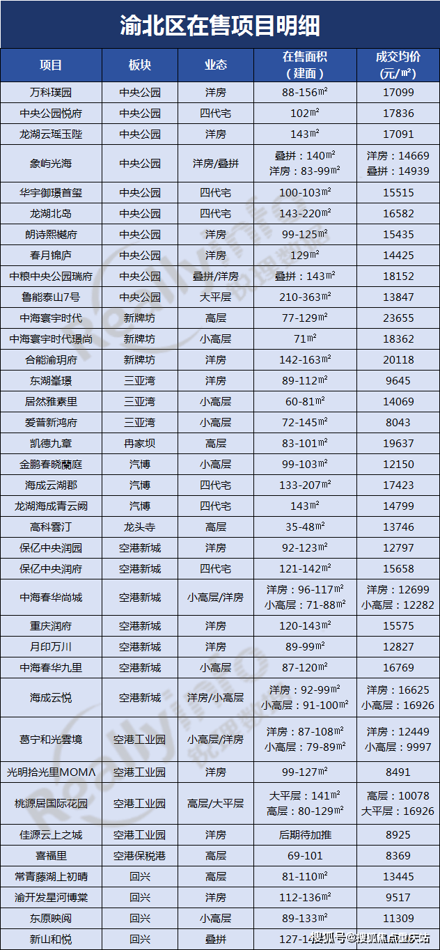 渝北区在售项目明细,方便大家了解项目和市场。