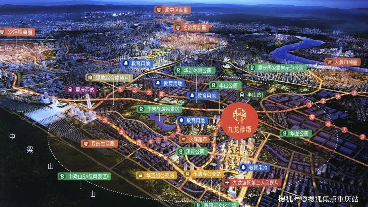 ?公园:地处九龙坡生态绿肺中心,紧邻国家4A级风景区华岩旅游风景区,坐拥河滨公园,周边更环绕八大生态公园,中梁云林公园、华岩风景区、国家攀岩示范公园、中梁山风景区等