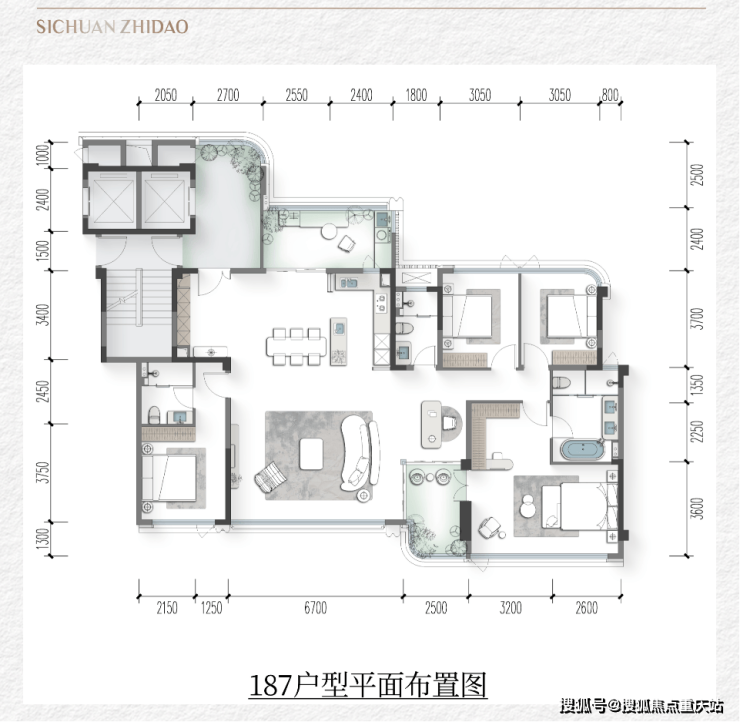 183㎡户型:拥有一般超过200㎡户型才有的“一户三花园”配置,将院墅的感觉植入大平层。