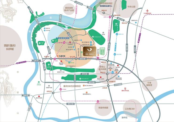 3、优越的地段位置:项目位于礼嘉核心,礼嘉作为两江新区的核心板块,也是重庆北区的钻石几何中心。整个礼嘉板块有别于主城其他板块的发展,规划有全能的智慧产业、轨道、医疗、教育、公园、旅游休闲配套和滨江资源,是主城为数不多的配套先行的区域,目前规划的配套已尽数落地,是重庆北区优质的改善置业地。