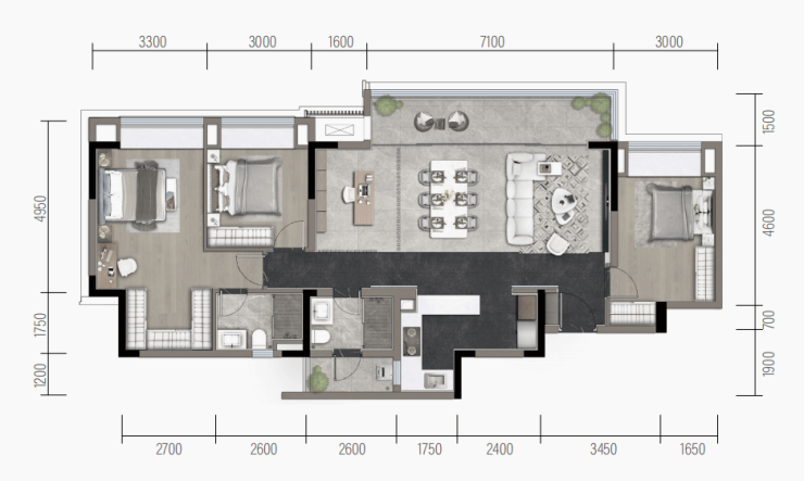 动静分区合理:整体格局通透舒适,既能满足家庭日常活动的亲密互动需求,又能保证私人空间的静谧性。