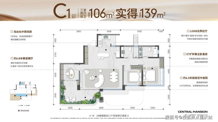最大约130%实得率,约6.3米挑高空中院落,革新高端人居生活想象。