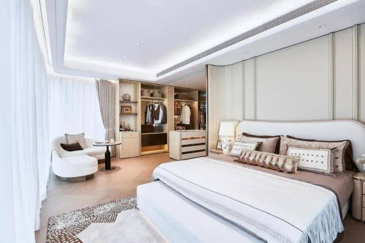 设计创新之处在于将传统四合院的水平意象垂直重构为“立体院落聚落”。“十字中轴蝶式围合”布局让户户拥有私享中央花园,同时通过洄游式中西厨岛厅与墅级主卧套房的纵向功能分层,形成清晰的家庭生活逻辑。这种布局,既保留了传统四合院“内向聚合、外御干扰”的精神内核,又适应了现代家庭对通透、开放与功能分区的复合需求。